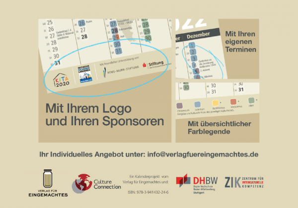 Der Interkulturelle Kalender entstand vor über 10 Jahren in Zusammenarbeit mit dem ZIK Zentrum für Interkulturelle Kompetenz und Sprachen der Dualen Hochschule Baden-Württemberg. In ansprechendem Design gibt dieser einen Überblick auf die bedeutendsten Feiertage der fünf größten Weltreligionen, verzeichnet kulturelle Feste wie auch gemeinsame Gedenktage. Er ist ideal für Einrichtungen, in denen interkulturelle Begegnung stattfindet. Hier unterstützt er den Dialog zwischen verschiedenen Ethnien und Religionen.